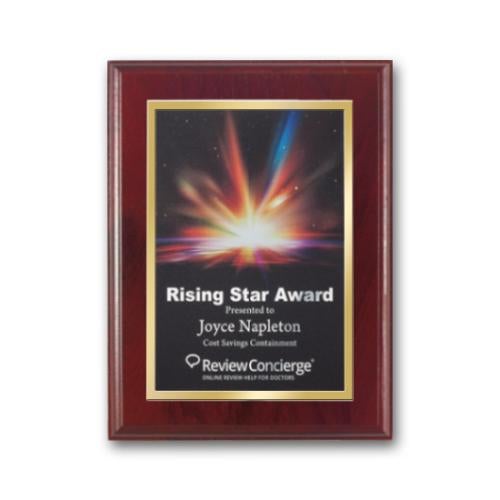 The SpectraPrint™ Plaque - Mahogany Gold is a distinguished award that perfectly marries traditional elegance with modern printing technology. Its lustrous gold plate provides a vivid canvas for any personalized message or image, ensuring that your accolade shines in full color against the rich mahogany-finished walnut. Ideal for recognizing achievements or commemorating special occasions, this plaque reflects a sense of prestige and timeless style. Whether it's for corporate recognition, academic accomplishments, or personal milestones, this piece is designed to convey appreciation with a lasting impression. Let the SpectraPrint™ Plaque be the hallmark of excellence in your award repertoire.