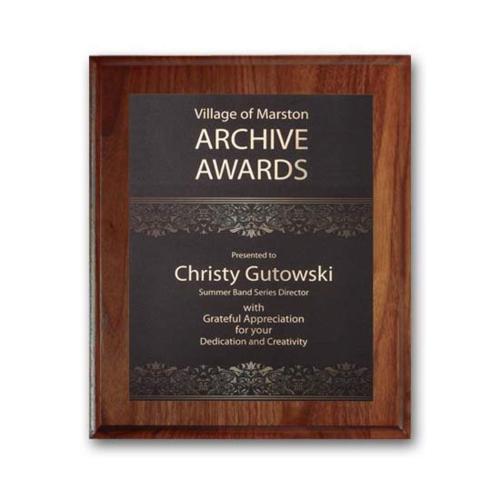 Of the Full Color Plaques, this beautiful SpectraPrint™ Plaque - Cove Edge Gold is a great choice. (7402.19-CE) Digitally reproduce your artwork in full color on a gold plate, mounted to our walnut plaque with cove edges.