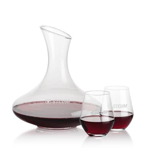 Of the Carafes, this beautiful Innisfil Carafe & Reina Stemless Wine is a great choice. (BWC7181-2RN) The large 50oz capacity and wide bowl of the Lead-Free Crystalline Innisfil Carafe is perfect for serving full-bodied red wines like cabernet sauvignon. Paired with 2 or 4 of our Reina Stemless Crystalline wine glasses and packaged in a satin-lined gift box to make an elegant gift for a special VIP or deserving employee.