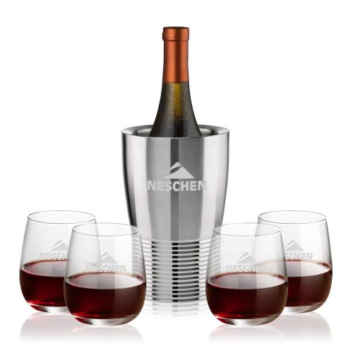 Of the Barware Gift Sets, this beautiful Genoa Wine Cooler & Crestview Stemless Wine Set is a great choice. (SST10421-2CV) The Genoa Wine Cooler & Wine Glass Set brings a sleek, contemporary touch to any gathering. The stainless steel Genoa wine cooler keeps bottles perfectly chilled with its smooth, polished finish and modern ribbed design, while the crystal-clear wine glasses enhance every pour. Perfect for entertaining, gifting, or everyday enjoyment, this set combines style, quality, and functionality in one elegant presentation. Various wine glass styles are available.