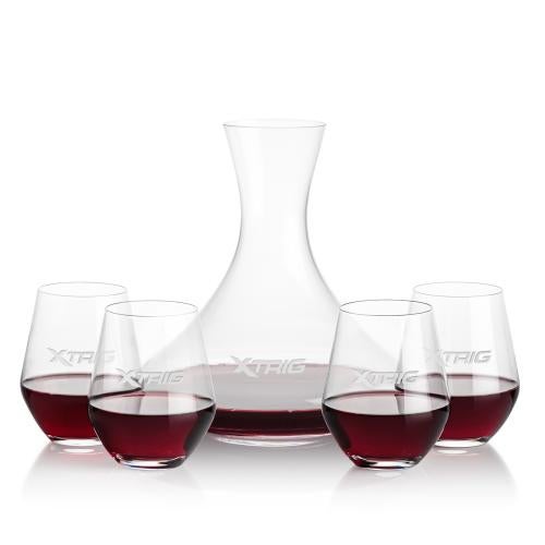 Of the Glasses Sets, this beautiful Senderwood Carafe & Reina Stemless Wine is a great choice. (SWD4511-2RN) The classic 48oz Senderwood Carafe set is an elegant and sophisticated gift for any occasion. The extra wide carafe makes it great for aerating and decanting your favorite vintage. Paired with 2 or 4 of our lead free Crystalline 11.5oz Reina stemless wine glasses.