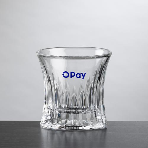 Of the On the Rocks Tumblers & Glasses, this beautiful Langstaff OTR - Imprinted is a great choice. (DCC6391) The Langstaff OTR boasts a thick base and captivating ridged pattern that wraps around its circumference, creating a visual masterpiece that catches and refracts light in all the right ways. This intricate design extends gracefully up to about halfway, adding a touch of opulence to your favorite spirits.