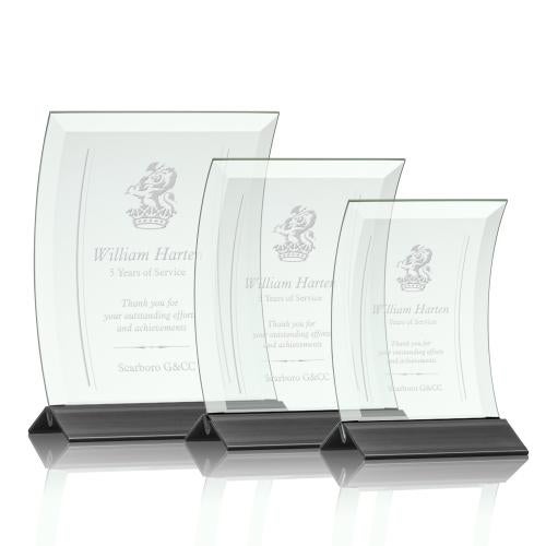 Of the Glass Awards, this beautiful Dominga Award - Jade/Black is a great choice. (AWJ6641-K) An elegant arc of jade crystal is beveled and curved, then mounted in a satin black brushed aluminum base to construct this understated award of unparalleled beauty.