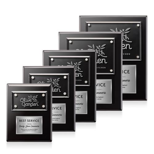 Of the Glass Awards, this beautiful Gossamer Plaque - Black/Silver is a great choice. (AWP2541-S) The refined and regal look of the Gossamer Wall Plaque will shine a spotlight on your special achievement. Features beveled Starfire Crystal, hand deep etched and offset from a solid black piano finished backing. Includes a two tone, brushed and polished silver double plate.