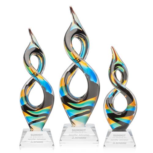 Of the Glass Awards, this beautiful Cosenzo Award on Sheffield Base - Clear is a great choice. (ARG6351-FC) For a bold departure from the predictable, discover the captivating elegance of our Cosenzo Art Glass Award. Its flowing infinity-inspired form is a mesmerizing interplay of movement and balance, while vibrant ribbons of blue, teal, amber, and black swirl together in a dynamic dance of color. Each piece is individually hand-shaped and colored by skilled artisans, ensuring that no two are exactly alike. The solid optical crystal base offers a refined, etchable surface for logos, names, or messages, making it as personal as it is striking. Ideal as a decorative centerpiece or as an unforgettable recognition piece, the Cosenzo transforms any presentation into a visual celebration.