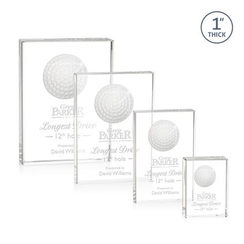 Of the Golf Awards, this beautiful Pennington Golf Award is a great choice. (GLF651) Celebrate excellence on the green with our stunning **1" thick** rectangular Optical Crystal Pennington Award. This freestanding elegant accolade features a striking golf ball centerpiece, creating a mesmerizing 3D effect that captures the spirit of achievement. Crafted with precision and sophistication, it's the perfect tribute for honoring outstanding performance in the world of golf or any other prestigious accomplishment.