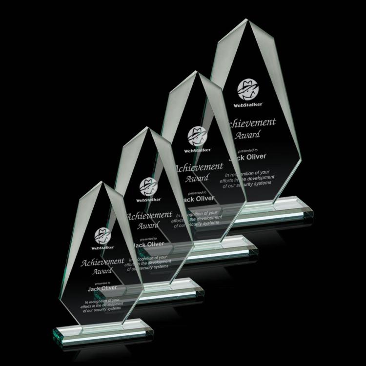 The jade glass recognition awards are available in a wide range of sizes, shapes and designs. These affordable trophies are made in geometrics like squares, triangles and circles, in the shape of arches and diamonds, as globes or columns.