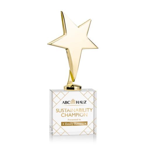 Of the Metal Awards, this beautiful Tuscany Gold Star VividPrint™ Award on Woodlawn Base - Clear is a great choice. (OPSV3101-GWC) The Tuscany Star VividPrint Award on Base is a radiant symbol of success, featuring a sleek rising star mounted atop a refined Optical Crystal base. Available with your choice of gold or chrome star finishes, it adds a touch of elegance and distinction to any recognition. With various crystal base styles to choose from, this award can be tailored to perfectly honor outstanding achievement. Various bases available. Bring your design to life with brilliant full-color VividPrint, adding depth and vibrancy to every detail of your artwork.