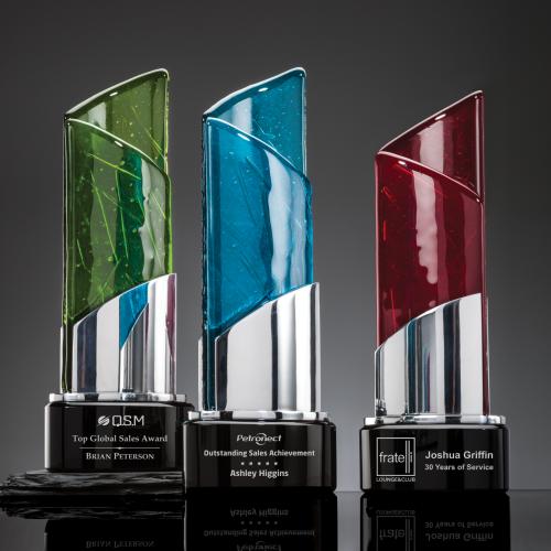 Of the Retirement Awards, this beautiful Encore Award is a great choice. (7646.29-G) The Encore is a complex construction of fused concave, angled art glass pieces surrounded by curved polished aluminum sleeves to echo the shape of the art glass. Available in Ruby, Blue Topaz or Peridot, the sculpture is mounted to a polished metal plinth and then placed on an ebony optical crystal base to give contemporary elegance to any achievement. 1 Colorfill Included