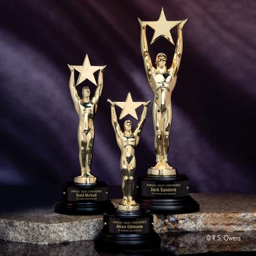 Of the Sales Awards, this beautiful Gold Star Achievement Award is a great choice. (3818.19) The R.S. Owens original gold plated cast metal Star Achievement award is presented on an ebony finished wood base with a laser engraved black brass plate. ©RS Owens & Co.