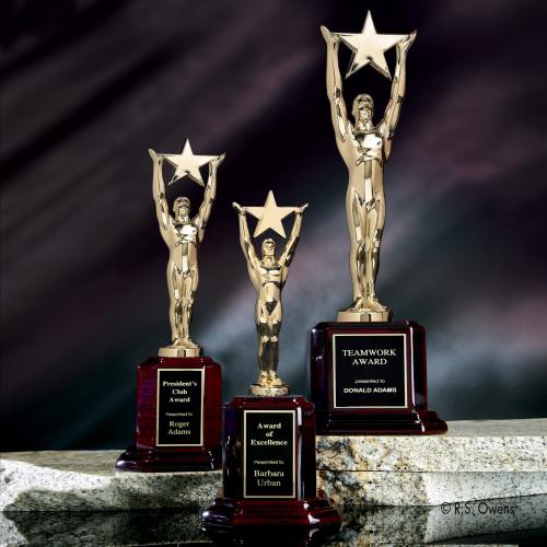 Of the Sales Awards, this beautiful Star Achievement Award on Rosewood is a great choice. (3819.19) The R.S. Owens original gold plated cast metal Star Achievement award is presented on a rosewood piano finished wood base with a laser engraved black brass plate. ©RS Owens & Co.