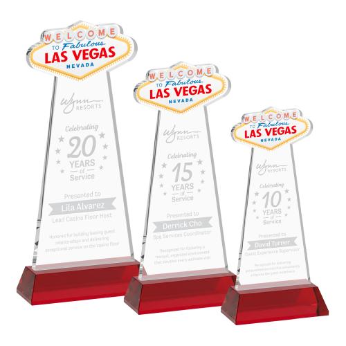 Of the Sales Awards, this beautiful Las Vegas Award on Hartford Base - Red is a great choice. (AWS42761-R) What happens in Vegas deserves to be celebrated in style. The Las Vegas Award is crafted from premium starfire crystal, featuring an iconic Las Vegas sign cutout at the top with a vibrant printed design included. Mounted on a side-tapered crystal base, this striking piece is perfect for recognizing standout achievements and unforgettable milestones. Second Position Etch & Colorfill is optional.