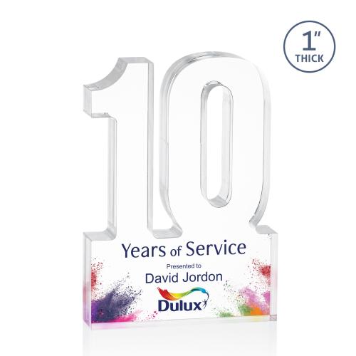 Of the Years of Service Awards, this beautiful 10 Years of Service Award Acrylic Number is a great choice. (AWDV428-10) Celebrate a decade of dedication with our 10 Years of Service Award crafted from stunning, clear acrylic. This award, beautifully designed in the shape of the number "10," serves as a distinguished emblem of achievement. At one inch thick, it offers a substantial yet elegant presence, making it a perfect desktop or shelf display. The award's vibrant base can be customized with the recipient's name and company logo, adding a personal touch to this remarkable keepsake. Ideal for honoring commitment and excellence, this award is a standout choice for recognizing valued team members.